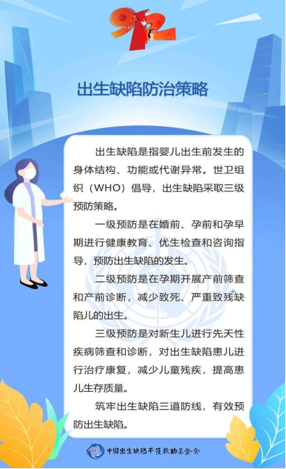 为了减少出生缺陷的发生,世界卫生组织提出了“三级预防”的口号,对孕前或孕早期、孕中期、产后三个不同阶段,采取不同的预防手段。