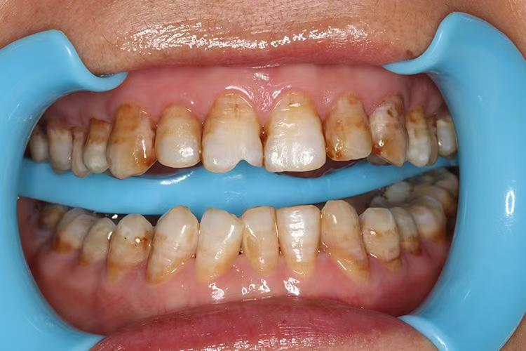 2.中度(着色型): 牙齿表面出现黄褐色或棕色的斑块,影响美观,但牙体形态没有明显缺损。