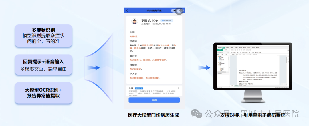 病史采集: 模拟医生问诊思路,通过多模态交互方式引导您充分描述病情,智能生成结构化病史信息,提高就诊效率。