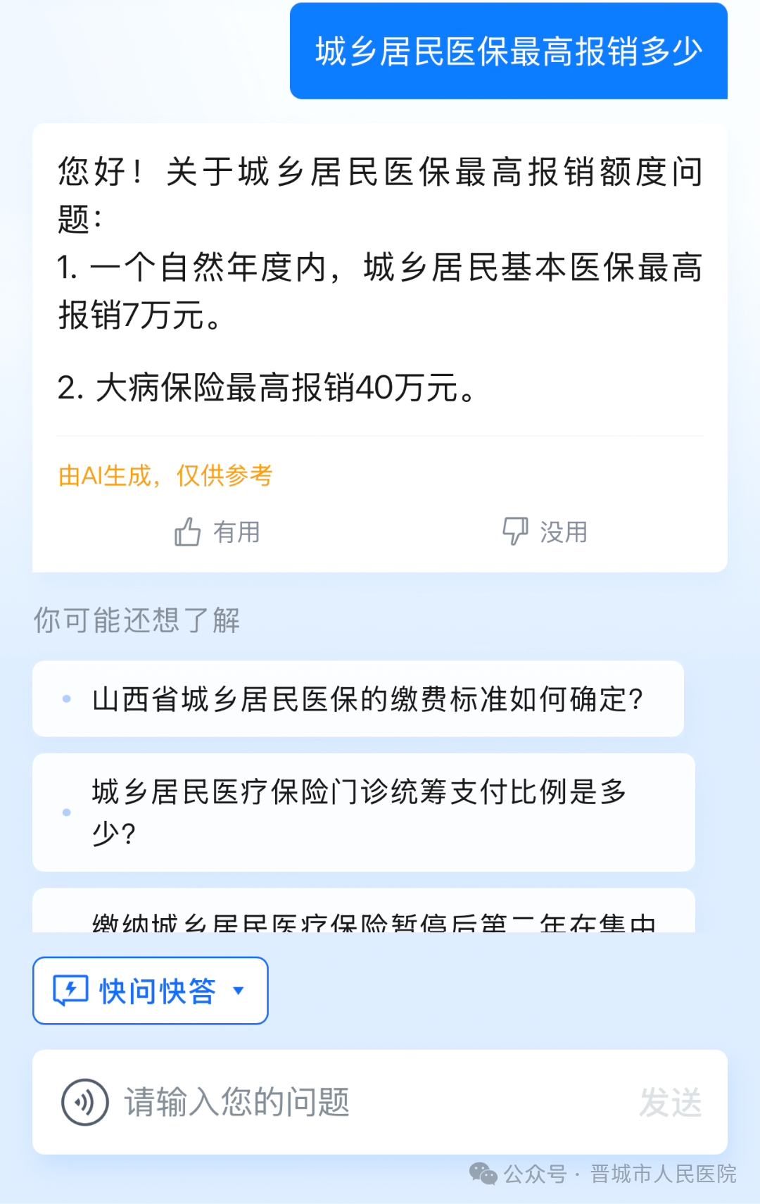 适用于较为简单的问题,AI思考时间更短,生成回答速度更快。例如:城乡居民基本医保门诊慢特病报销比例是多少;城乡居民基本医保最高报销多少等,都可使用“快问快答”模式快速解答问题。
