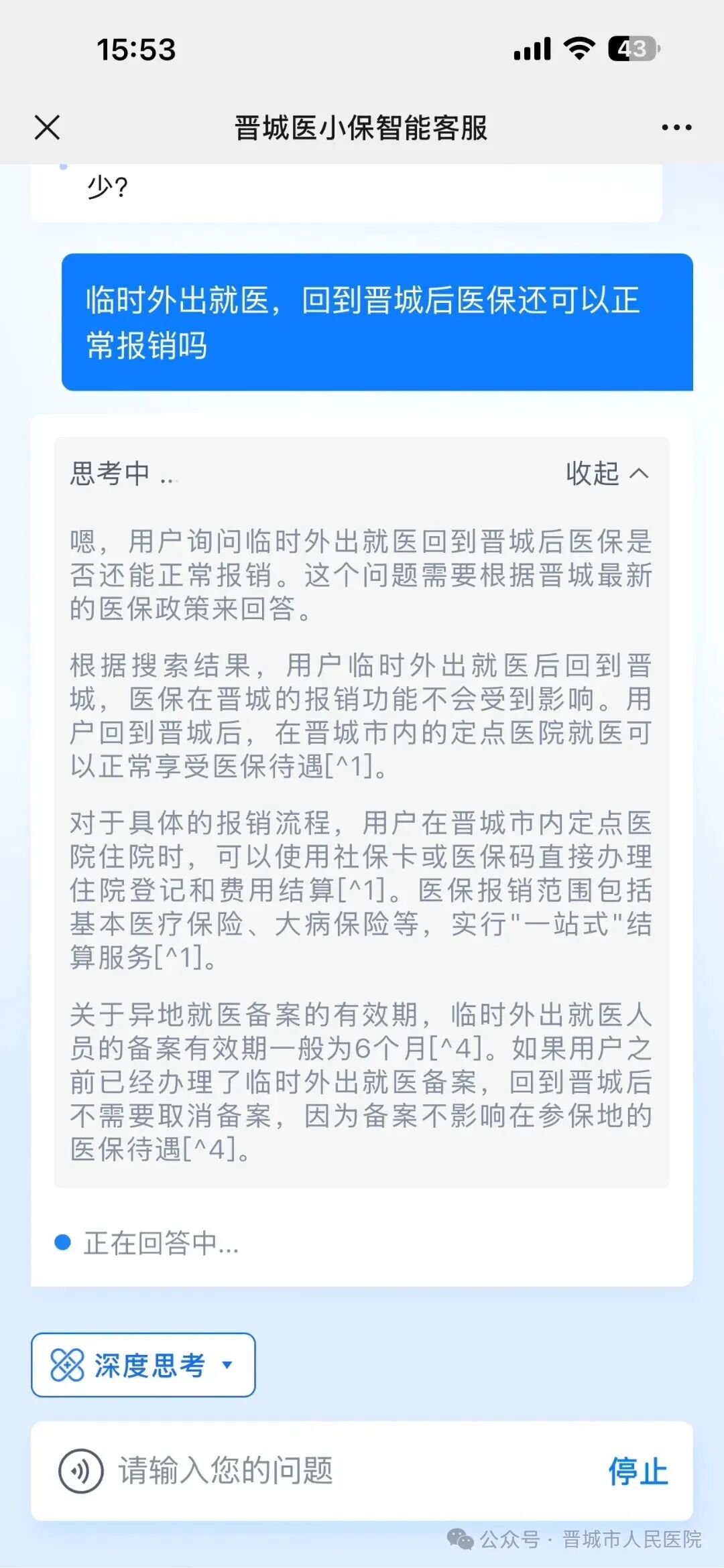 适用于较为复杂的问题,AI思考时间较长,生成的回答也更为全面。例如:临时外出就医,回到晋城后医保还可以正常报销吗;新生儿医保如何办理等,在经过智能客服深度思考后,便可获得准确回复。