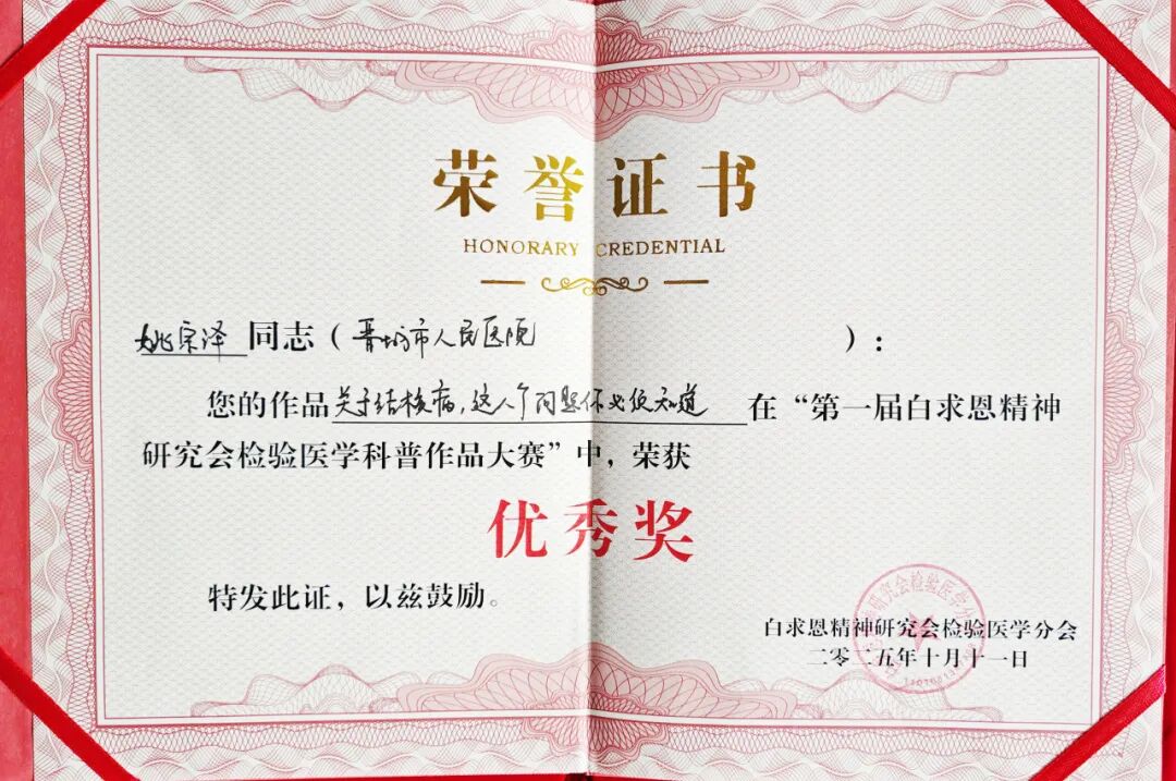 此次获奖不仅是对我院检验医学科普工作的一次肯定,也激励着我院全体医务人员继续传承和发扬白求恩精神,以更饱满的热情和更专业的态度,投入到检验医学知识的传播和全民健康素养的提升工作中去!