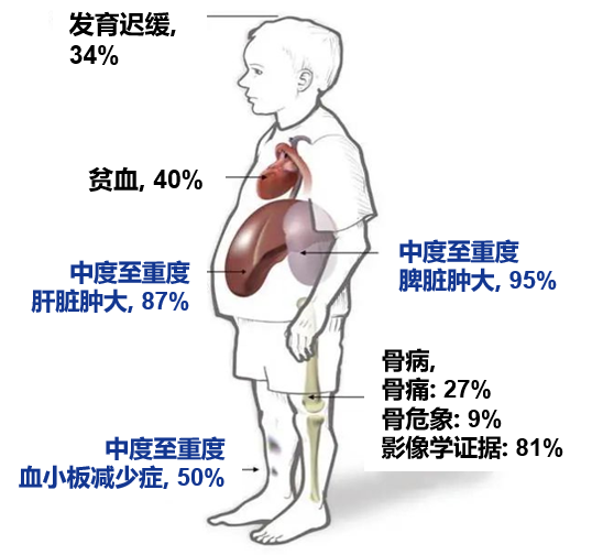 戈谢病表现为多脏器功能受累,最常见最明显的症状为肝脾肿大,临床表现为“大肚子”,可有血小板减少、贫血等症状,部分有骨痛,生长迟缓的表现。II型/III型戈谢病患儿还会出现神经病变,表现为认知障碍、精神运动发育落后、癫痫等。