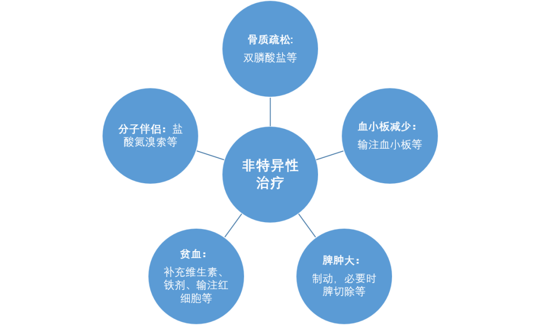 戈谢病目前主要的治疗方法有特异性和非特异性治疗。特异性治疗包括酶替代治疗、造血干细胞移植、底物抑制疗法以及基因治疗。
