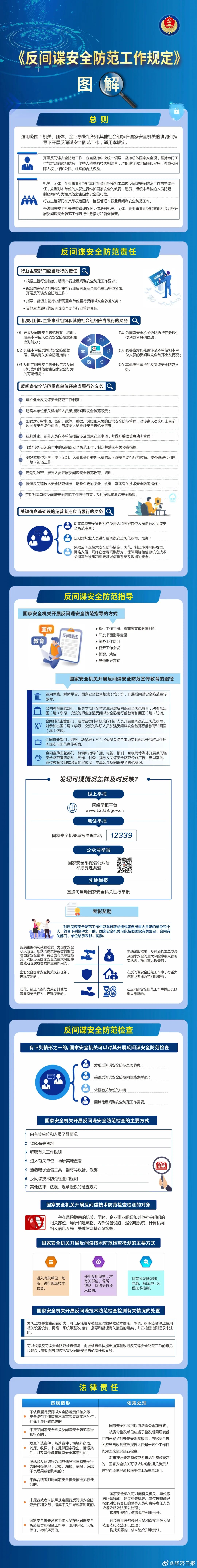 19、《反间谍安全防范工作规定》第4条:机关、团体、企业事业组织和其他社会组织承担本单位反间谍安全防范工作的主体责任,应当对本单位的人员进行维护国家安全的教育、动员、组织本单位的人员防范、制止间谍行为和其他危害国家安全的行为。国家安全机关受理举报电话12339。