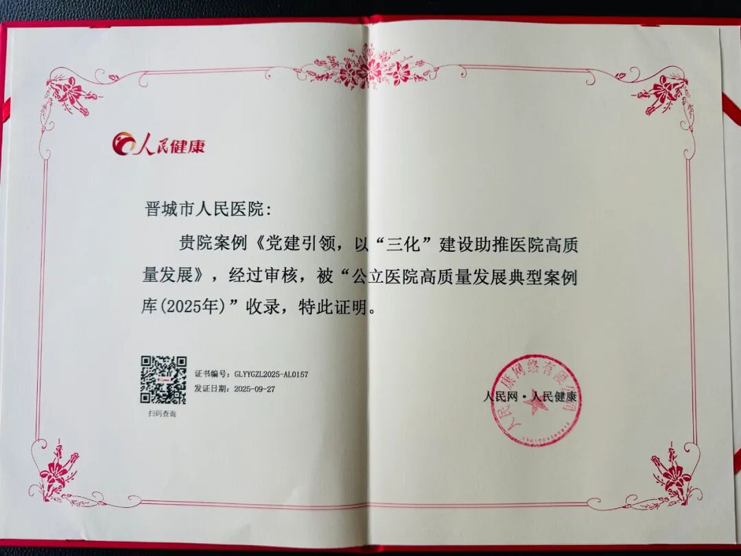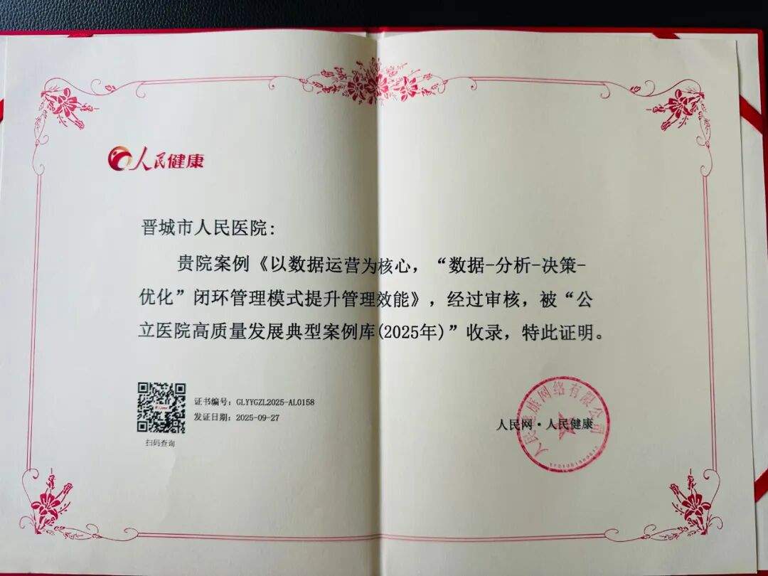 近日,从人民网・人民健康传来喜讯,晋城市人民医院两大实践案例 ——《党建引领,以 “三化” 建设助推医院高质量发展》《以数据运营为核心,“数据 - 分析 - 决策 - 优化” 闭环管理模式提升管理效能》成功入选 “公立医院高质量发展典型案例库(2025 年)”,并受邀参与9月27日在广州举办的 “2025 公立医院高质量发展专题调研交流总结” 活动。这两项荣誉不仅是对医院发展成果的权威认可,更彰显了医院在党建引领文化建设与精细化经济运营管理领域的标杆实力。