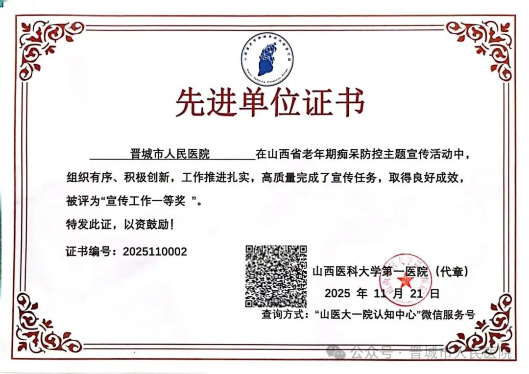 近日,2025年山西省老年期痴呆防控主题宣传活动先进单位名单正式公布,晋城市人民医院凭借扎实有效的工作表现荣膺一等奖,这一荣誉既是对医院在老年期痴呆防控领域工作的肯定,也彰显了其区域医疗服务的引领作用。