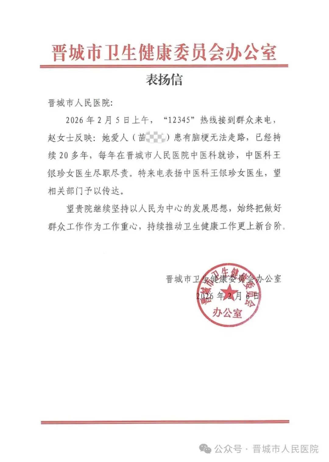 近日,晋城市卫生健康委员会办公室发来一封表扬信,字里行间满含群众对晋城市人民医院中医科王银珍医生的认可与感激。这份来自 “12345” 热线的群众反馈,不仅是对医生履职尽责的肯定,更见证了医患之间跨越时光的信任与温情。