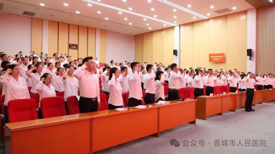 医院全体党员在党员大会上重温入党誓词。