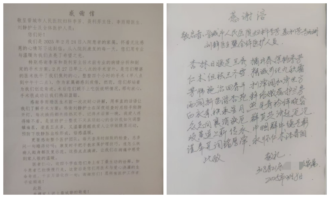 在晋城市人民医院妇产医学中心,每天都在上演着医术与温情交织的故事。42岁的刘女士近日带着两封手写感谢信出院,她的求医经历正是我们"技术+温度"服务理念的真实写照。