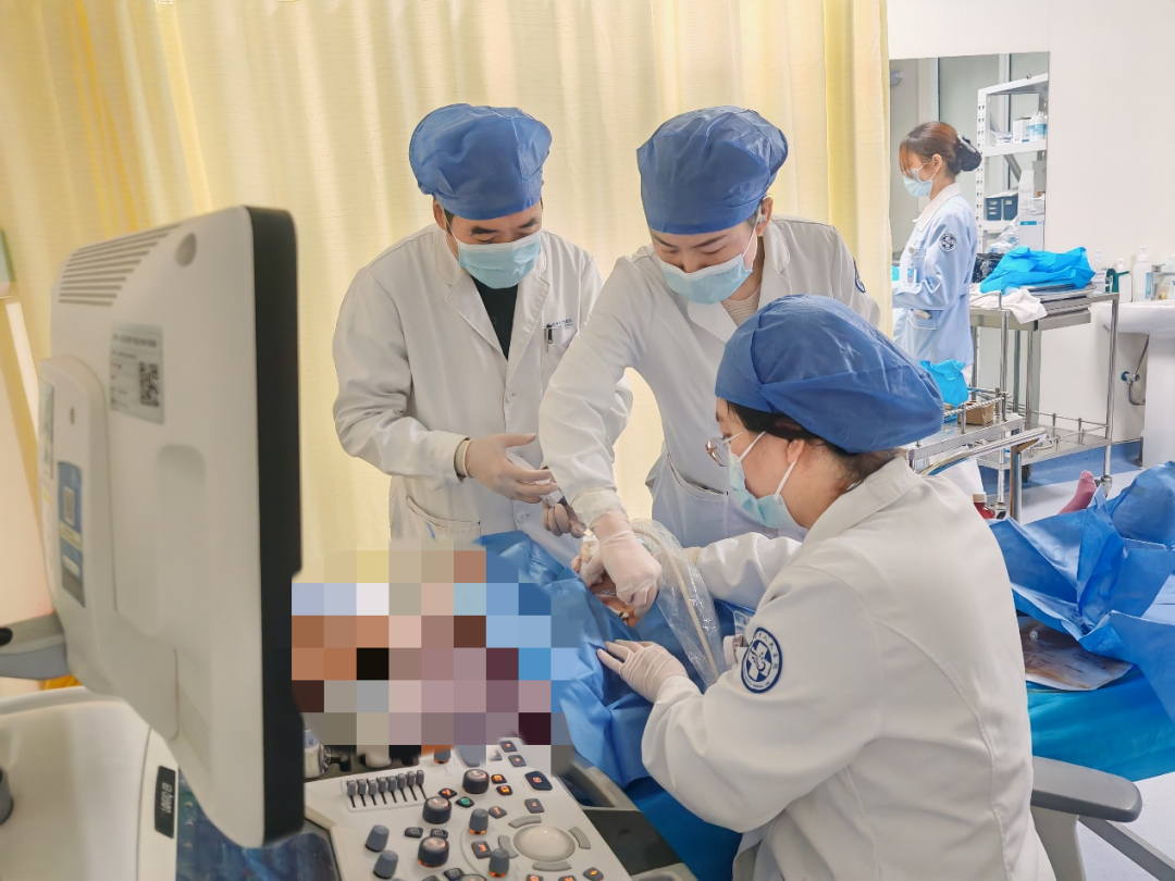 面对这一复杂情况,介入与血管外科主任张敬强第一时间组织团队展开研讨。考虑到患者的年龄、身体状况以及手术意愿,团队明确了 “以微创介入为核心,分阶段安全治疗” 的思路。副主任王丽云带领王交运、杨敏敏等医护人员,仔细分析患者的各项检查数据,反复推演治疗流程,最终敲定了 “先穿刺引流减压,再分阶段硬化治疗” 的个性化方案。