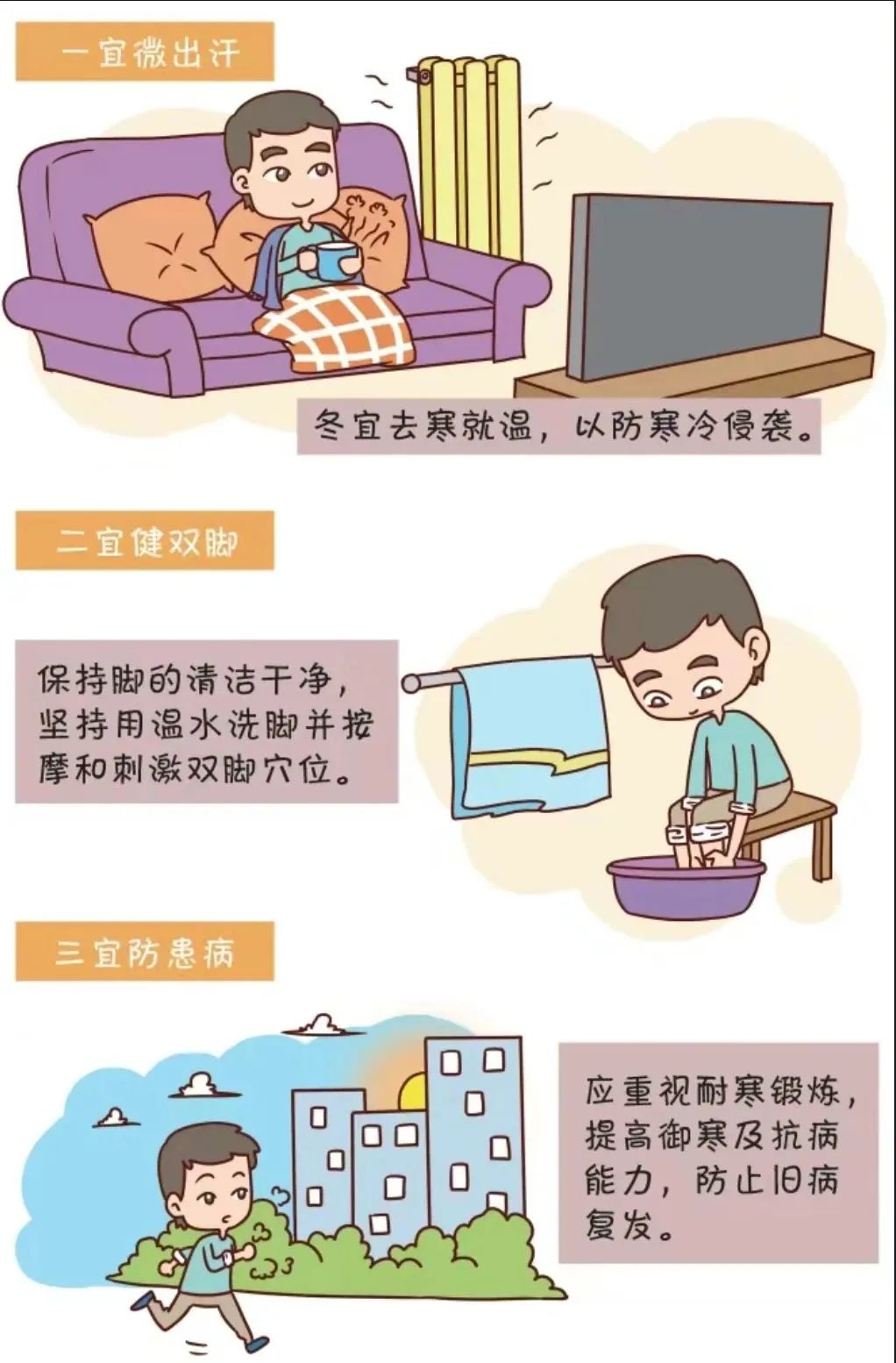 还有防脚寒,可以常做足浴,水温40°左右,水淹没踝关节处,每次浸泡20~30分钟,泡足后擦干用手按摩足趾和脚掌心2~3分钟,做完之后最好半小时内睡觉。另外,足浴不宜在饭后立即进行,糖尿病病人浸泡水温不宜太高。