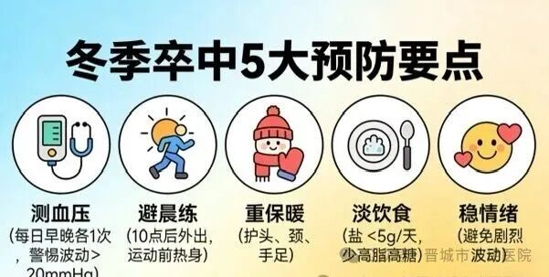 避晨练:避免清晨低温时外出,建议上午 10 点后再活动,运动前先热身 5-10 分钟,避免剧烈运动;