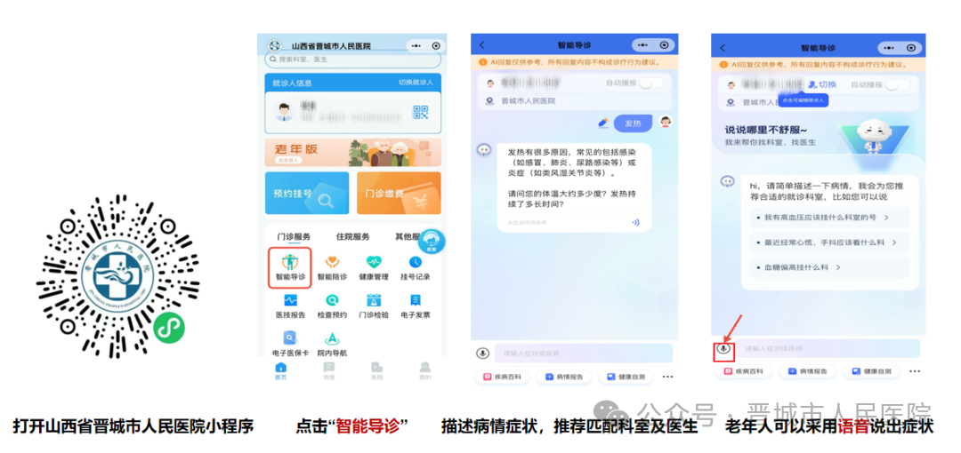 除了打字输入您的症状外,针对老年人,我们还嵌入了语音输入症状的方式。有了智能导诊,看病的第一步就变得简单、明确了。不管是平时的小毛病还是突发症状,它都是你值得信赖的“导航员”。再也不用为挂错号、跑错科而烦恼,看病效率大大提高。