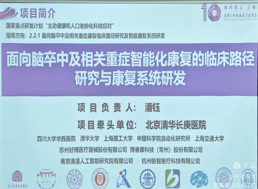 在11月24日举办的 “十四五科技部重点研发计划——脑卒中重症康复智能化研究暨重症康复指南标准培训班” 上,我院正式成为该重点研发计划的应用推广单位。此次活动于北京清华长庚医院盛大举行,该项目由北京清华长庚医院牵头,潘钰教授担任负责人,四川大学华西医院、清华大学、上海理工大学、中国科学院自动化研究、上海交通大学等多所知名院校及机构共同参与。