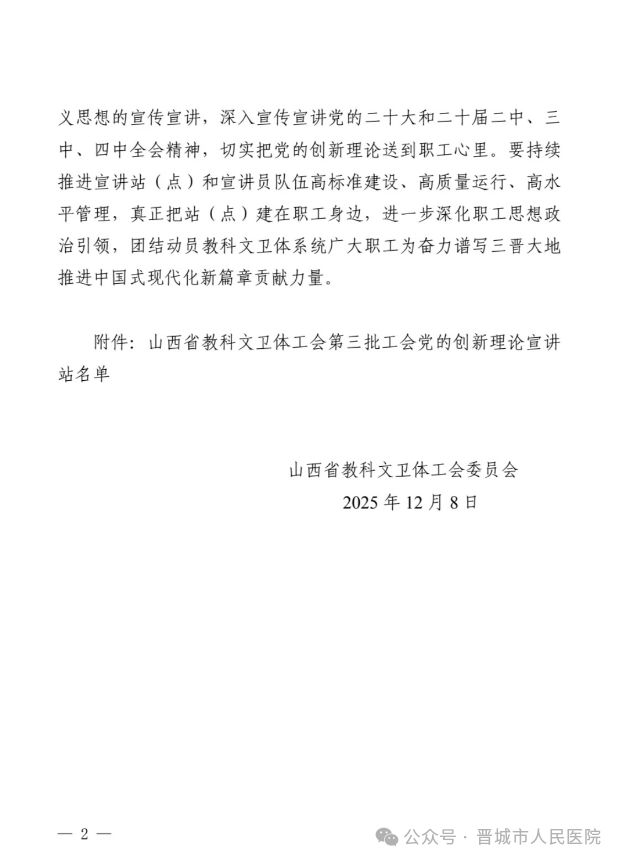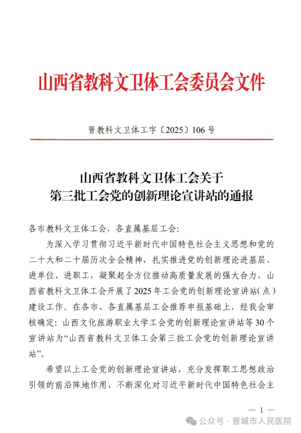 近日,山西省教科文卫体工会印发《关于第三批工会党的创新理论宣讲站的通报》(晋教科文卫体工字〔2025〕106号),经推荐申报与严格审核,院工会党的创新理论宣讲站成功入选 “山西省教科文卫体工会第三批工会党的创新理论宣讲站”。