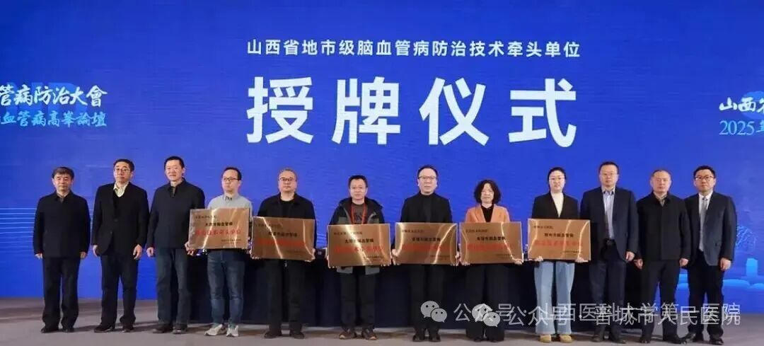 12月6日,2025年山西省脑血管病防治大会在太原召开。会上,晋城市人民医院被山西省卫生健康委员会正式授予“山西省地市级脑血管病防治技术牵头单位”牌匾,标志着我院在区域脑血管病防治体系中的引领地位获得省级权威认可。