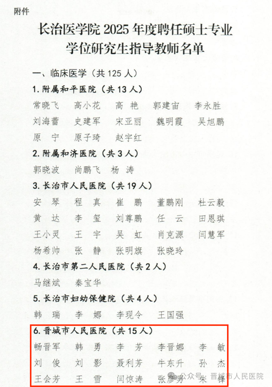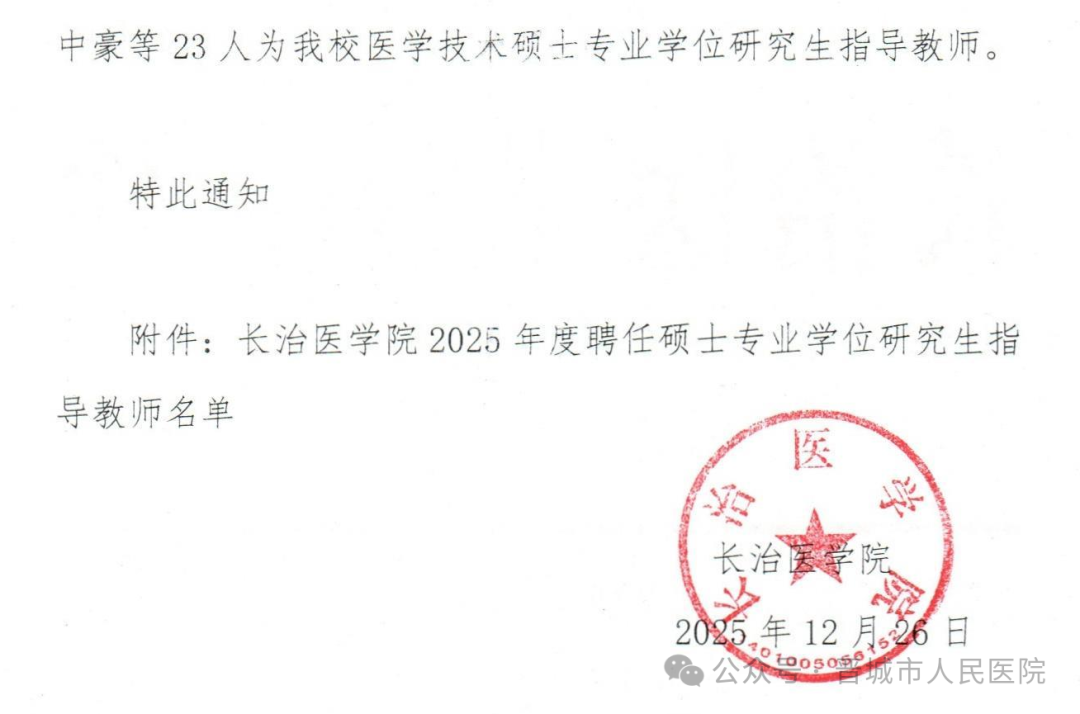近日,长治医学院2025年硕士研究生指导教师遴选结果正式公布,我院畅晋军、牛东升、张彦男、李芳、刘俊、聂利芳、李晋娜、刘影、孙杰、李敏、王会芳、王雪、闫惊涛、韩勇、朱锋等15名医师成功获聘为硕士研究生指导教师,为我院高层次医学人才培养队伍注入强劲新动能。