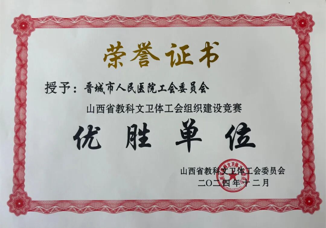近日,山西省教科文卫体工会组织建设竞赛结果揭晓,晋城市人民医院工会凭借扎实的工作成效和显著的服务成果,从众多参评单位中脱颖而出,荣获 “山西省教科文卫体工会组织建设竞赛优胜单位” 称号。这一荣誉不仅是对晋城市人民医院工会工作的高度认可,更是对其积极践行工会使命、服务职工群众的有力褒奖。