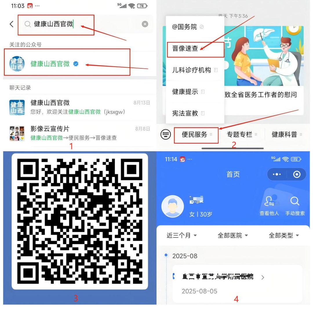 微信搜索栏输入“健康山西官微”,点击进入官方公众号;或者扫描“健康山西官微”提供的官方二维码,直接进入公众号。
