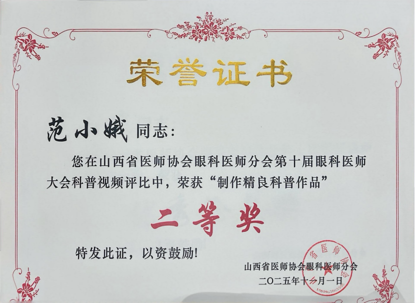 本次大会以“晋聚光明 精彩传承”为主题,汇聚了来自省内外千余名眼科专家与科普工作者,是山西省眼科领域最具影响力的学术盛会之一。我院眼科积极参与,不仅在科普视频评比中斩获佳绩,更在学术研究与专业建设方面展现出卓越实力。