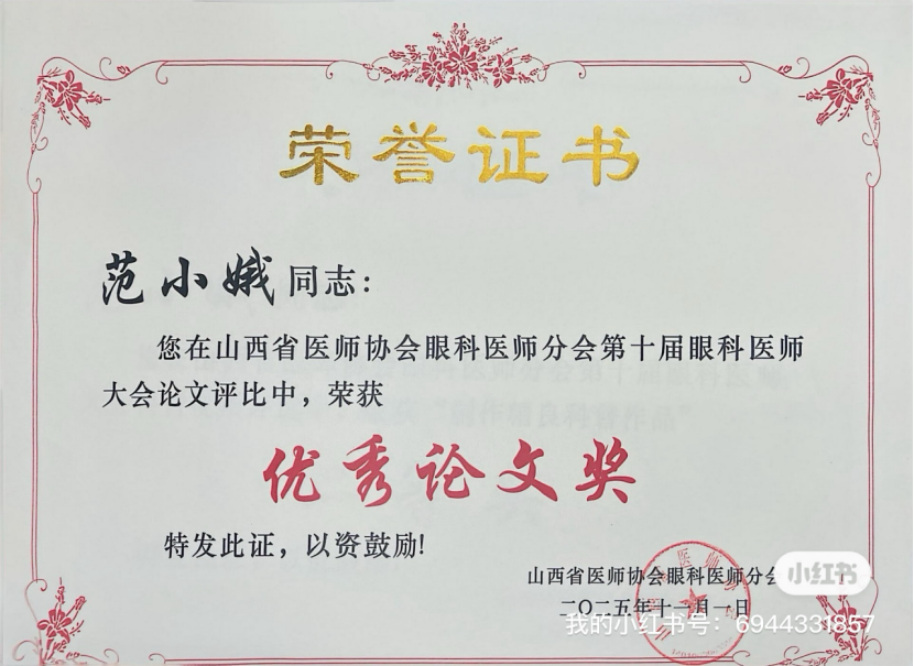 除了科普成果,我院眼科团队在科研方面也再传喜讯——关于干眼症治疗的研究论文《负载环孢素A的活性氧响应性阳离子纳米滴眼液治疗干眼症的研究》荣获“优秀论文奖”。