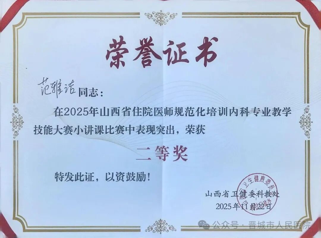 近日,2025年山西省住院医师规范化培训内科专业青年师资小讲课比赛在省内顺利举办。此次大赛由山西省卫生健康委员会主办,于11月20日至21日期间完成初赛与决赛的全部赛程。我院内分泌科青年带教老师范雅洁凭借参赛作品《一锤定音?— 糖尿病的诊断》,历经多轮激烈角逐,最终脱颖而出,荣获大赛二等奖。