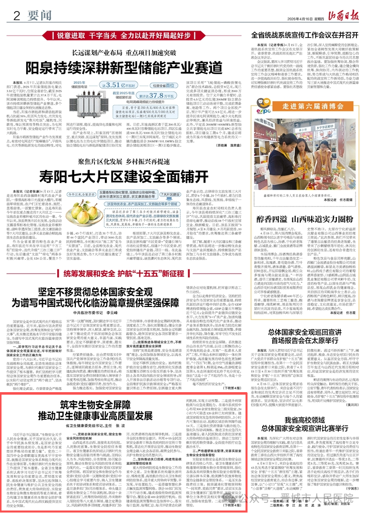 生物安全是事关国家安危、人民健康的“国之大者”。全省卫生健康系统将始终坚持以总体国家安全观为指引,提高政治站位、强化责任担当,从严从实抓好风险防控、监测预警、应急处置等各项工作,为推进健康山西建设、筑牢国家生物安全屏障贡献卫健力量。