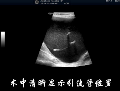 治疗第一步是穿刺引流减压。张奶奶取平卧位,医护人员对手术区域进行常规消毒铺巾后,用1%利多卡因进行局部麻醉。随后,在超声的实时引导下,将一次性8.5F PTCD引流管精准置入囊腔内,缓慢间断地引出囊液约2000ml,相当于4瓶矿泉水的量。引流结束后,张奶奶当即感觉腹痛、腹胀症状明显缓解,当天进食量就有所增加。