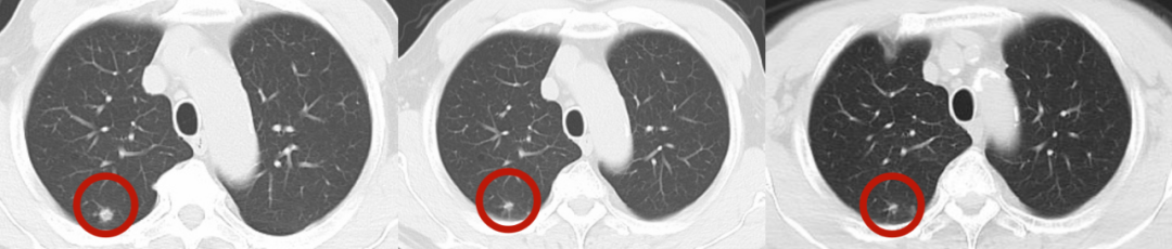 (左图为放疗前病灶影像,中图为放疗后1月病灶影像,右图为放疗后2月病灶影像,可见肿瘤逐步缩小)