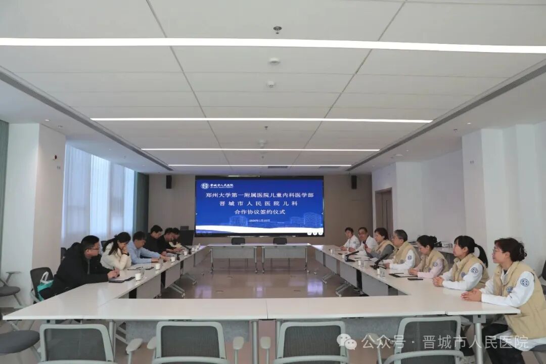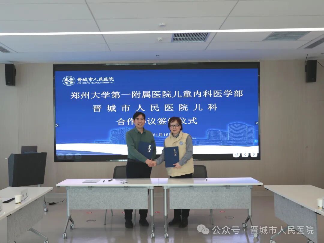 为持续提升儿科医疗服务能力,切实让辖区患儿在家门口享受到高水平优质医疗资源,近日,晋城市人民医院儿科与郑州大学第一附属医院儿童内科医学部正式达成战略合作,双方合作协议签约仪式在我院第六会议室隆重举行。这标志着我院儿科学科建设与医疗服务水平迈上新台阶,开启了区域儿童健康保障事业协同发展的崭新篇章。