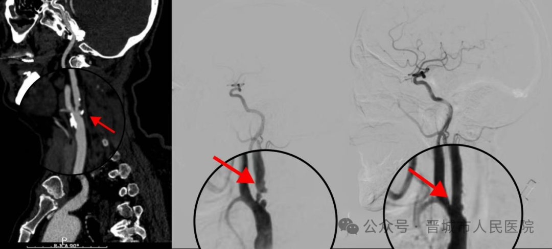 (图一是介入手术前的头颈部CTA影像,箭头所指处为狭窄部位;图二是手术前DSA影像;图三是支架术后DSA影像,血管狭窄明显改善)