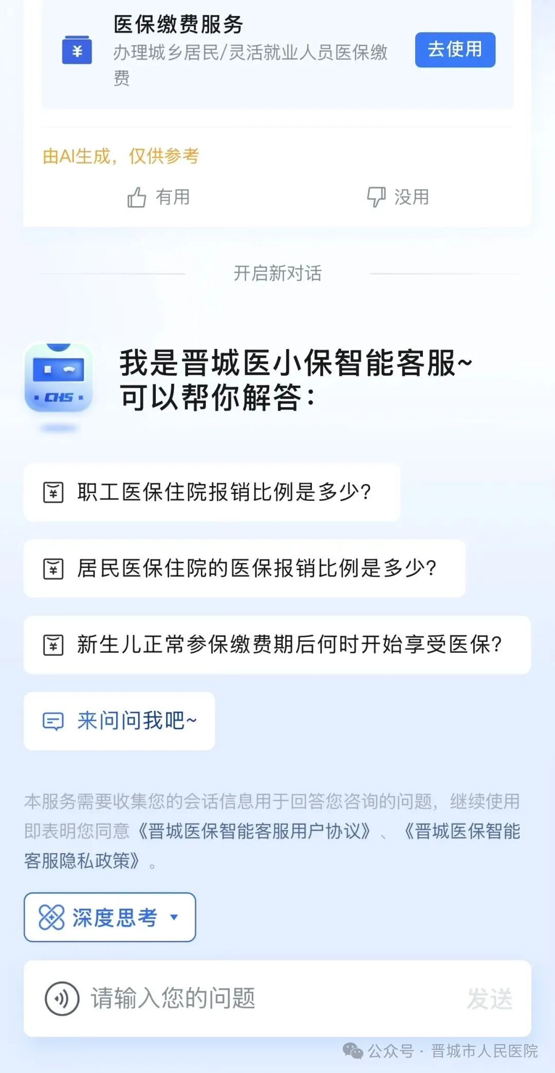 适用于较为复杂的问题,AI思考时间较长,生成的回答也更为全面。例如:临时外出就医,回到晋城后医保还可以正常报销吗;新生儿医保如何办理等,在经过智能客服深度思考后,便可获得准确回复。