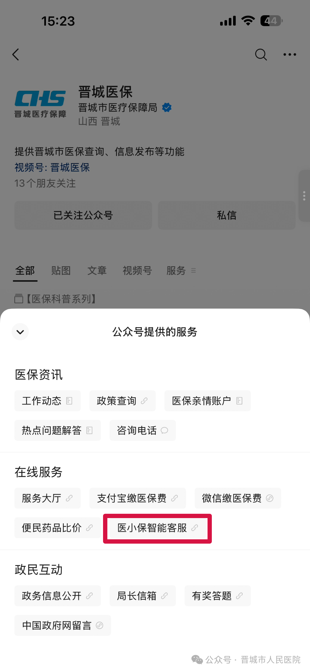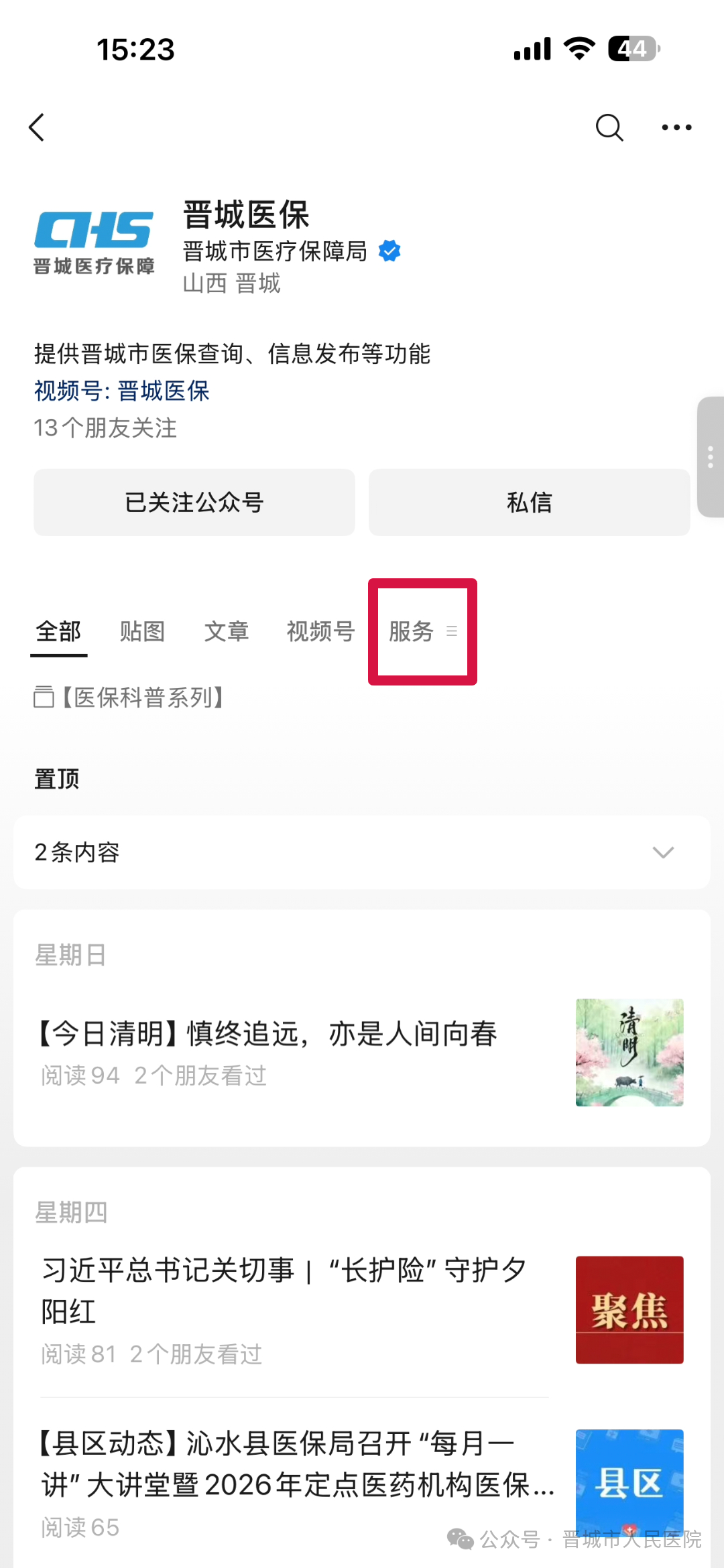 关注“晋城医保”微信公众号后,点击“服务”;