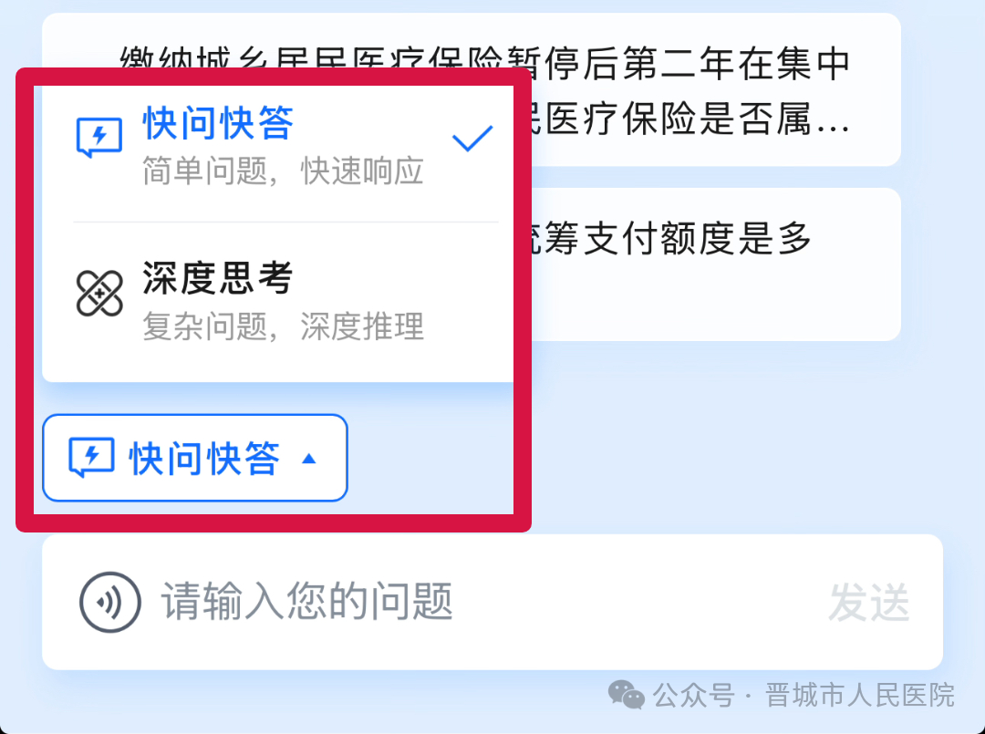适用于较为简单的问题,AI思考时间更短,生成回答速度更快。例如:城乡居民基本医保门诊慢特病报销比例是多少;城乡居民基本医保最高报销多少等,都可使用“快问快答”模式快速解答问题。