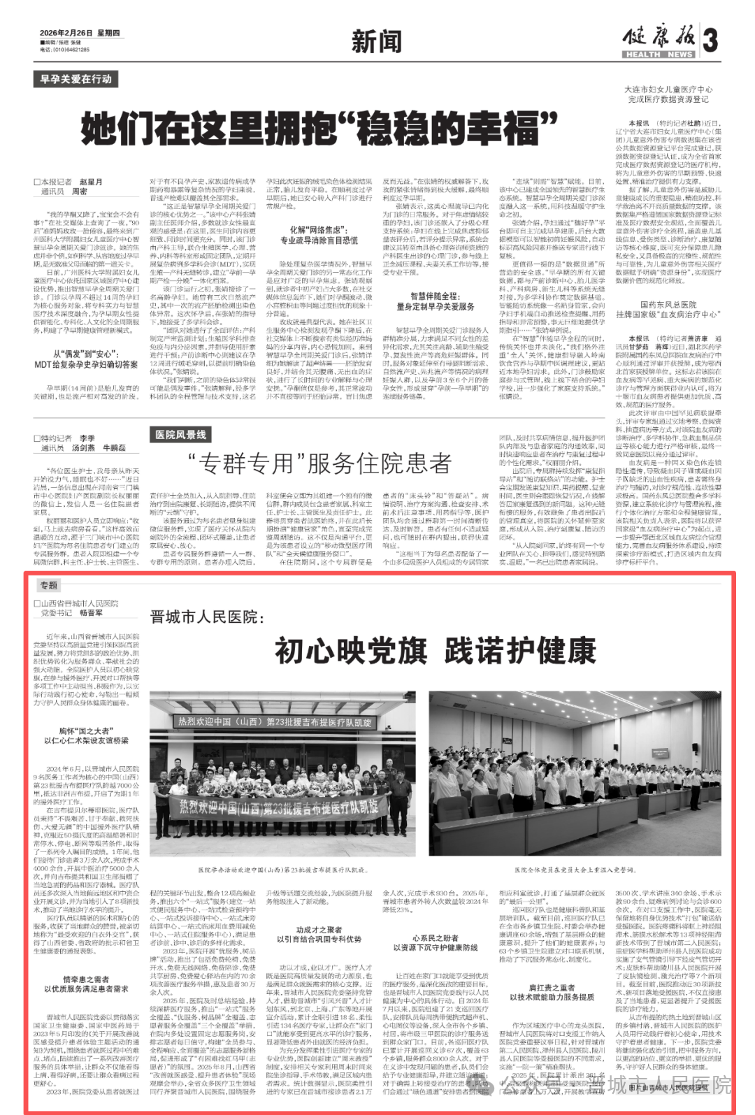 去年以来,该报先后多次刊文聚焦晋城市人民医院医改之路上的成功经验。今日,健康报第三版刊发文章《初心映党旗 践诺护健康》再次聚焦晋城市人民医院。